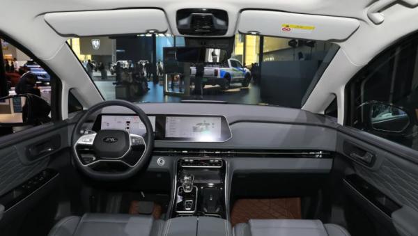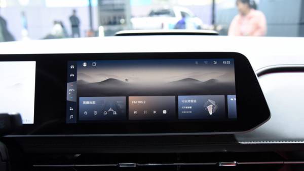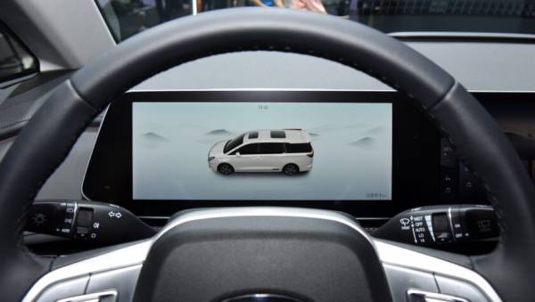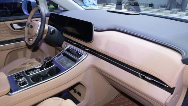 В салоне на передней панели расположен единый горизонтальный экран без козырька, совмещающий приборный дисплей и мультимедийную систему.